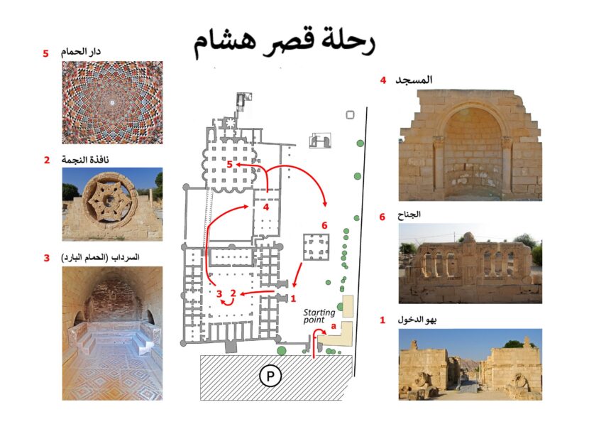 تقفون في هذه اللحظة في واحد من اكثر مواقع التراث الثقافي الفلسطيني أهمية: خربة المفجر او قصر هشام. بني هذا المجمع في القرن الثامن وسمي نسبة الى هشام بن عبد الملك، الخليفة الاموي. الخلافة الاموية (٦٦١–٧٥٠ م.) هي الثانية من اهم أربعة عهود للخلافة قامت بعد وفاة النبي محمد. استخدم القصر كمقر شتوي. كانت الإقامة فيه مرغوبة نظرا لفصول الشتاء المعتدلة. سكنت القصر العديد من السلالات الاخرى بعد الحقبة الاموية، لكن قاعة المقابلات والحمامات كانت قد تدمرت بزلزال ٧٤٨/٧٤٩ القوي. ستتمتعون اثناء زيارتكم لهذا الموقع الاثري بمشاهدة اطلال المباني الاموية الرائعة لقصر هشام.