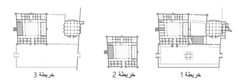 1 أ — ترى هنا خرائط مجمع القصر عبر المراحل الثلاث المختلفة. ما هو الترتيب الزمني الصحيح لهذه الخرائط الثلاث؟ ابدأ بالأقدم(مرحلة1) واختتم بالأحدث (مرحلة3).