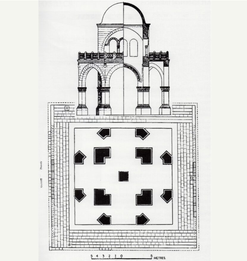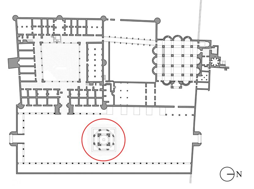 You are now standing next to the remains of the pavilion. This pavilion used to stand in the forecourt of the palace’s gardens and covered a fountain and a deep pool. It was built on four massive pillars with a high dome at the top. Eight smaller pillars supported a balcony on arches. A water channel crossed the gardens and fed the fountain which was situated in the middle of the pool.