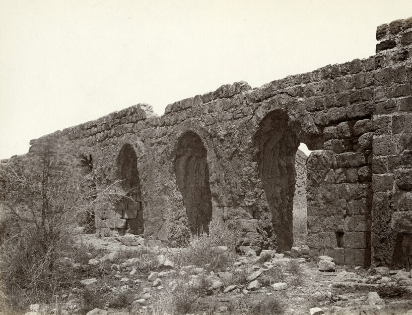 There is no internal water source at Hisham’s Palace. A major investment was needed for the Umayyads to secure the water supply of the palace. They built several constructions in order to transfer the water from the wadis and springs in the mountains to the palace. An example of such buildings is an aqueduct: a bridge which channels the water in the required direction. This picture shows an old aqueduct near Jericho.