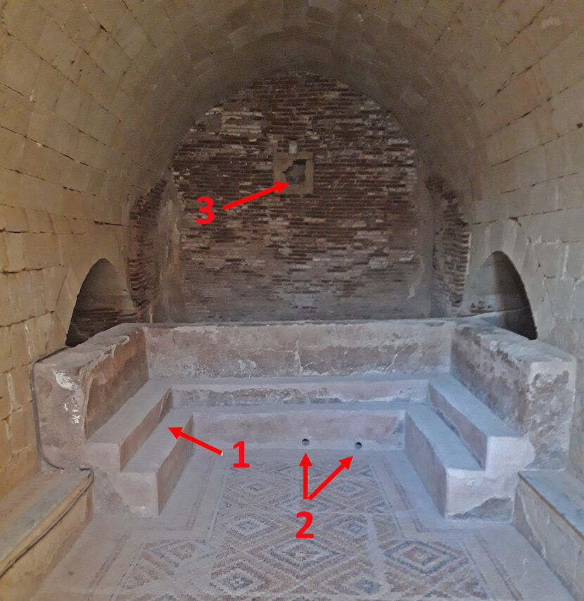 In this picture you see the technique which the Umayyads used to heat the water in warm-water bath houses. The bath house under the shelter (location 5 of this tour) is an example of this.