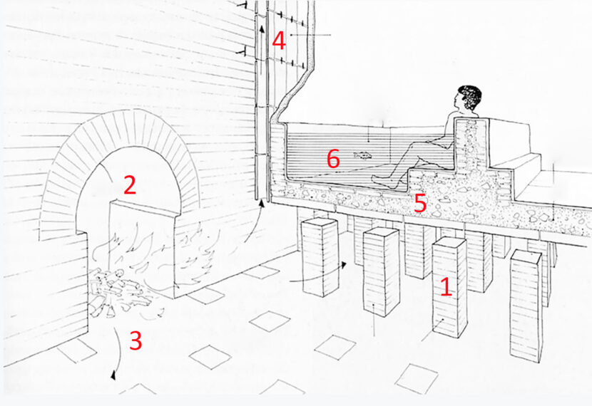 5. So now you are standing in the remains of a cold-water bath. Have a look at this picture. Compare it with the room you are standing in. What was the function of the different features in the bath house that are marked in the picture?