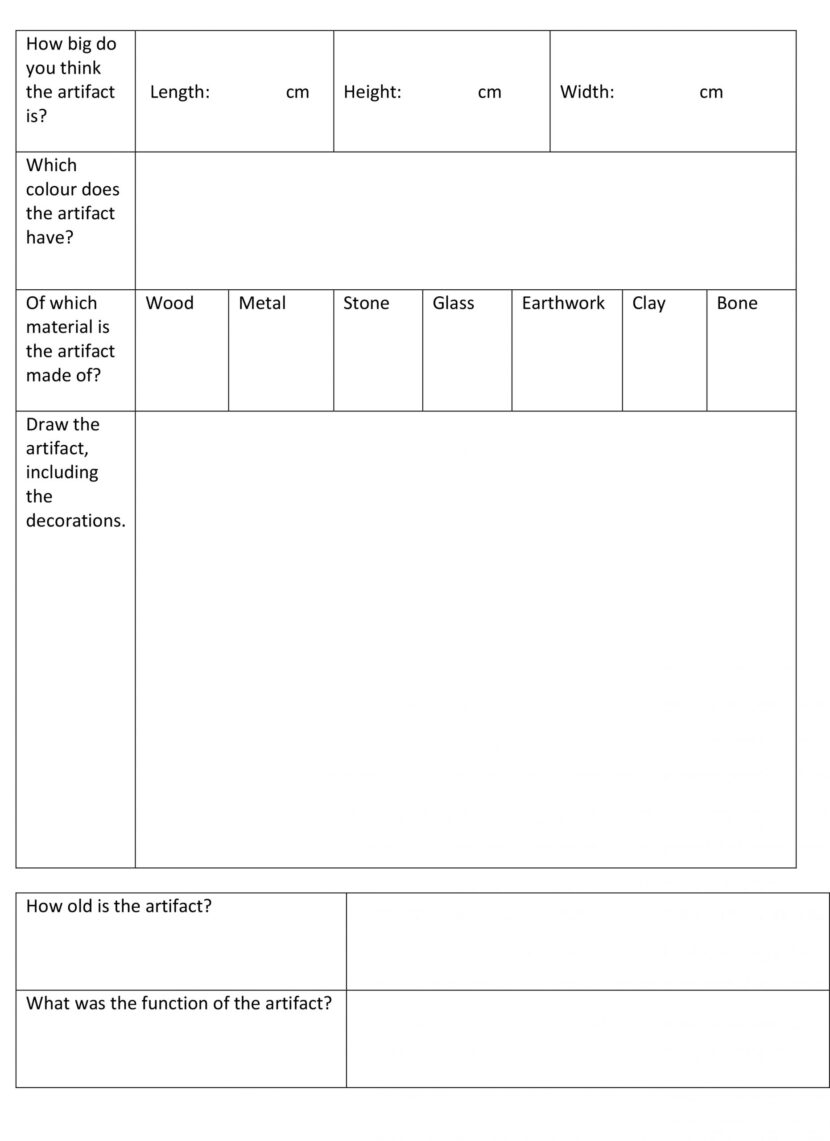 One of the tasks of an archaeologist is to study discovered objects very precisely, to describe them and to imagine how the object has been used in the past. Archaeologists call such objects ‘artefacts’. Sometimes archaeologists use an artefact card to describe the most important artefacts.