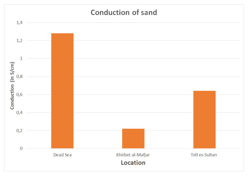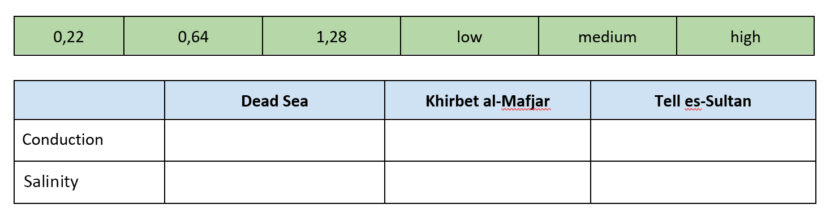 In January 2020 we went to the Dead Sea and to Jericho. During that trip, we did some salt tests. We gathered sand from the Dead Sea shore, Tell es-Sultan and Khirbet al-Mafjar. The sand monsters were dissolved in water and subsequently the conduction of the water was determined. The higher the conduction, the higher the salinity of the sand.