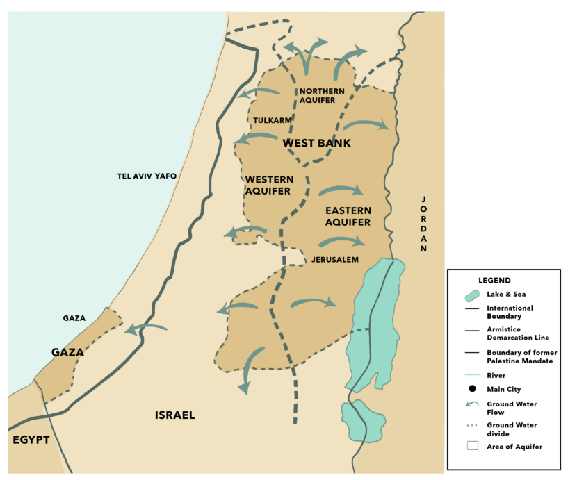 Also due to natural causes water from the aquifer flows away from the West Bank. As water searches for the lowest level, the flow direction at the western part of the Mountain Aquifer is from the east (mountains and upper slopes) to the west (coastal plain).