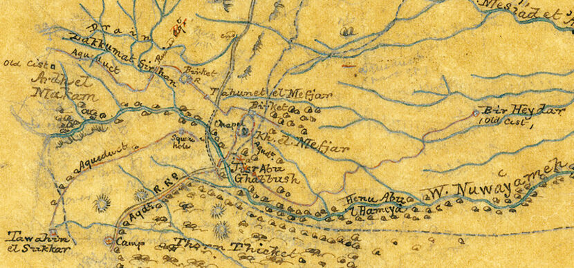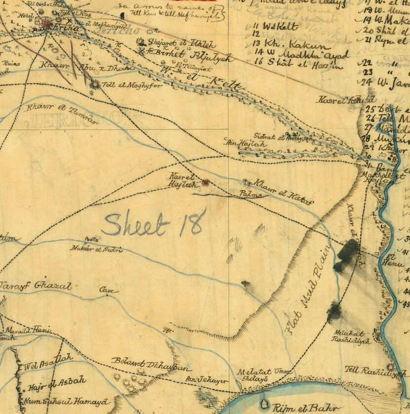 In the winter of 1873–1874 British researchers explored the region and made several geographical maps. Here you see two details of maps made during that campaign (21a and 21b). In one map the location of Eriha (Jericho) has been indicated. In the other the position of Kh. el Mefjar (Khirbet al-Mafjar or Hisham’s Palace) can be noticed.