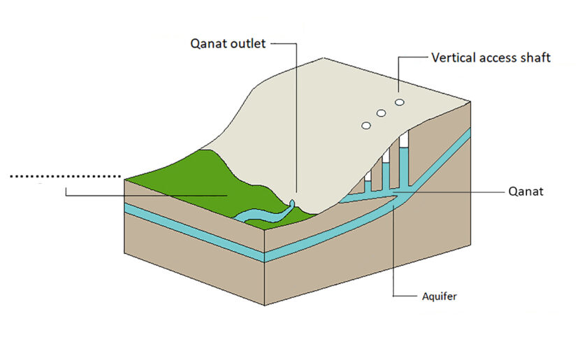 Have a look again at assignment 23. There we explained that in the past people built Qanats, underground tunnels, in order to transfer water to a specific place.