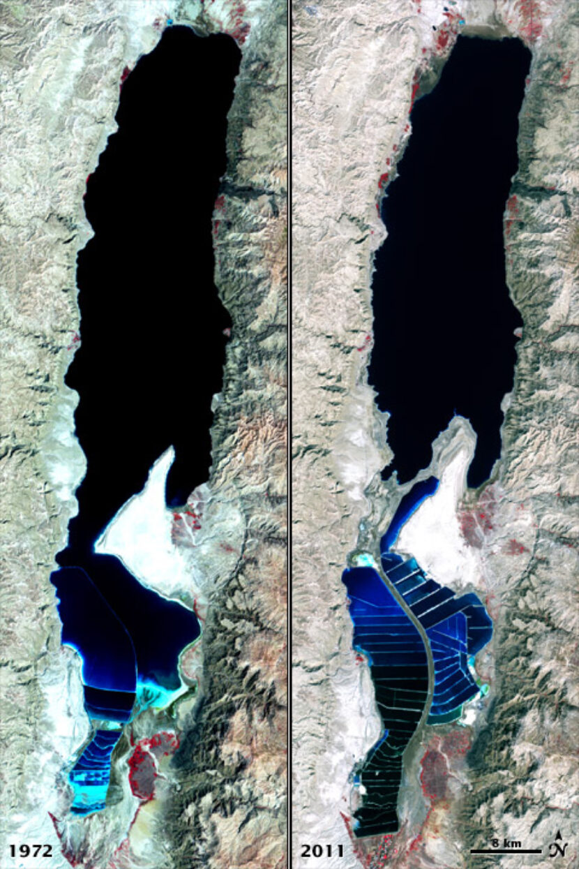 39. Both these consequences have the same effect on the sea level of the Dead Sea. Take a look at the satellite images of the Dead Sea. One satellite image was taken in 1972, the other one in 2011. The black spot in the middle of the images is the Dead Sea. What effect of higher temperatures can you notice on basis of these images?