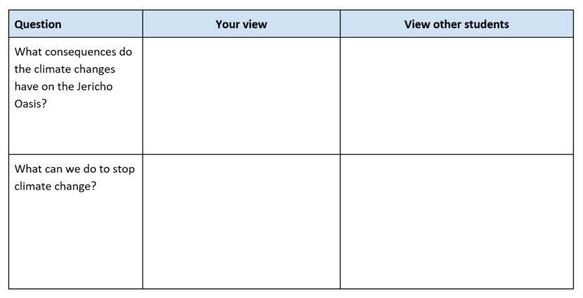 48. You started Task 4 – Climate change and Jericho – by discussing three aspects of climate change. Have your views changed after working on Task 3? How about the views of other students? Fill in the scheme.