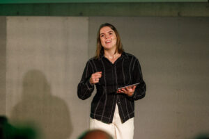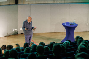 De Dag van de Duurzaamheid 2025 werd geopend met het ervaren van de natuur doormiddel van projecties en geluiden. Op deze manier werd de natuur voor 1 minuutje even de collegezaal ingehaald. Dagvoorzitter Aniek Moonen nam het publiek daarna mee in het verdere programma. Met de bevlogen en levendige Aniek, voormalig voorzitter van de Jonge Klimaat Beweging, was het programma in goede handen.