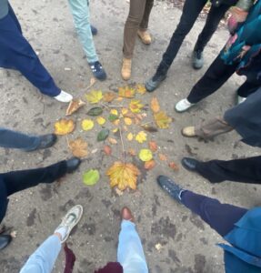 In de natuur vind je ook veel voorbeelden van wabi-sabi: schoonheid in het imperfecte. Dat kwam terug in de volgende oefening, waarbij we blaadjes verzamelden en ze samen in een mooi patroon neerlegden. De wind blies het vervolgens weer weg.