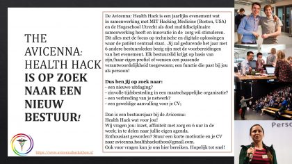 De Avicenna Health Hack is opzoek naar nieuwe bestuursleden! De Avicenna Health Hack is een jaarlijks evenement wat plaatsvindt in samenwerking met MIT Hacking Medicine…