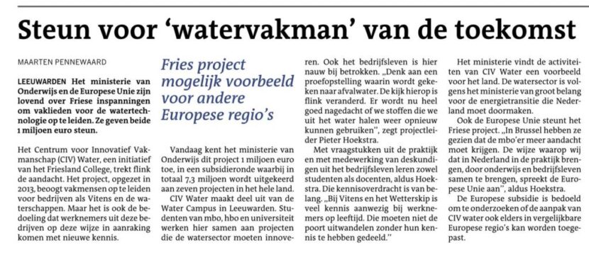 Goed nieuws: de RIF aanvraag ‘Hybride lerend systeem water’ is toegekend. Het Centrum voor Innovatief Vakmanschap, CIV Water over dit mooie nieuws: ‘Met de scale-up subsidie ‘Hybride lerend systeem water’ wil CIV Water een hybride leeromgeving realiseren, waarin onderwijs en bedrijfsleven met elkaar samenwerken en van elkaar kunnen leren. Deze subsidie ontvangt CIV Water van het ministerie van Onderwijs. Het ministerie vindt namelijk de activiteiten van CIV Water een goed voorbeeld voor het mbo-onderwijs in Nederland. De watersector is volgens het ministerie van groot belang voor de energietransitie die Nederland moet doormaken’.