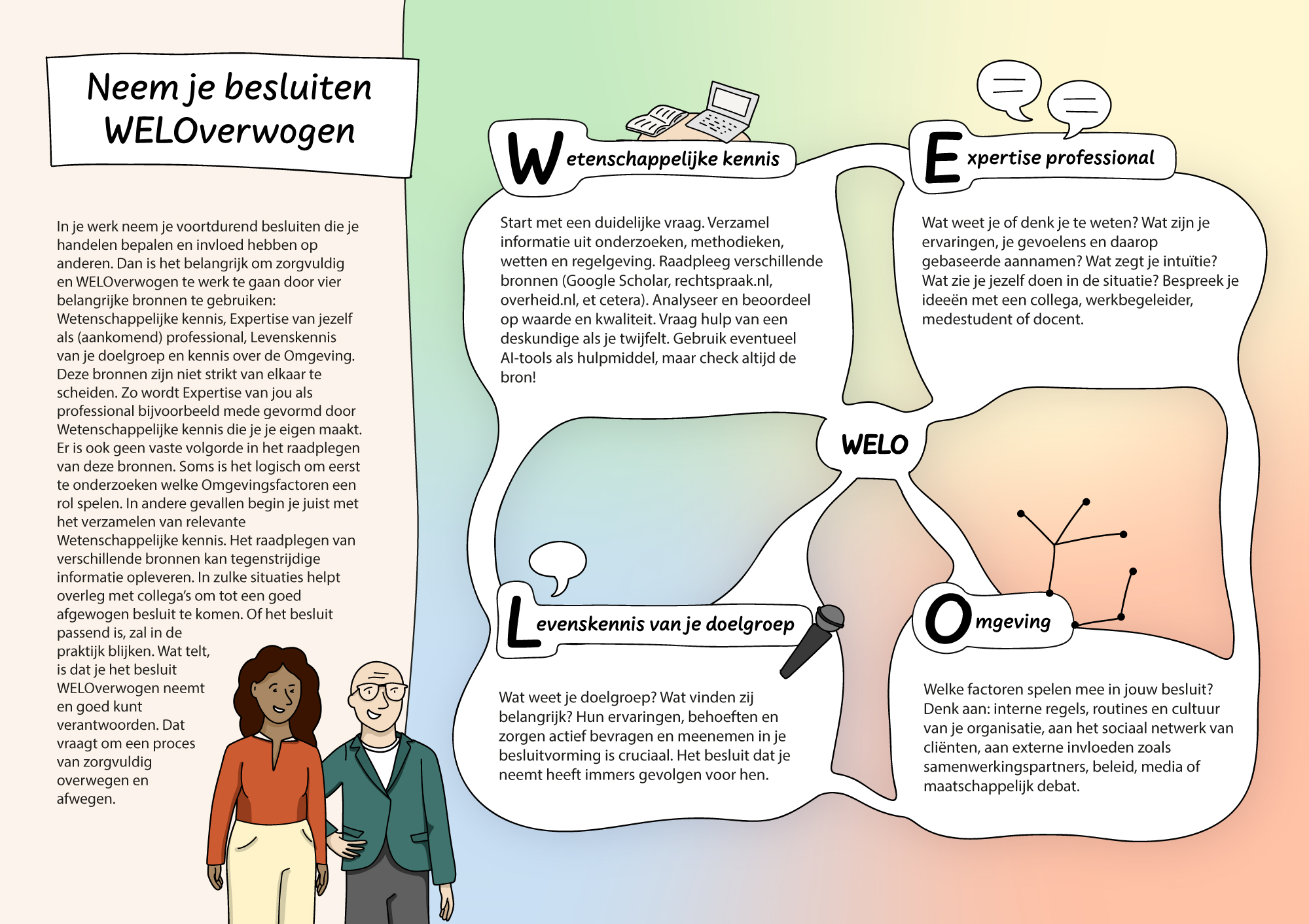 In je werk neem je besluiten die invloed hebben op je handelen en gevolgen voor anderen. Soms doe je dat snel en met weinig moeite. Soms is een situatie nieuw of complex of komt een vraagstuk steeds terug. Dan past het om WELOverwogen te werk te gaan. Zie de praatplaat hieronder of download de PDF versie